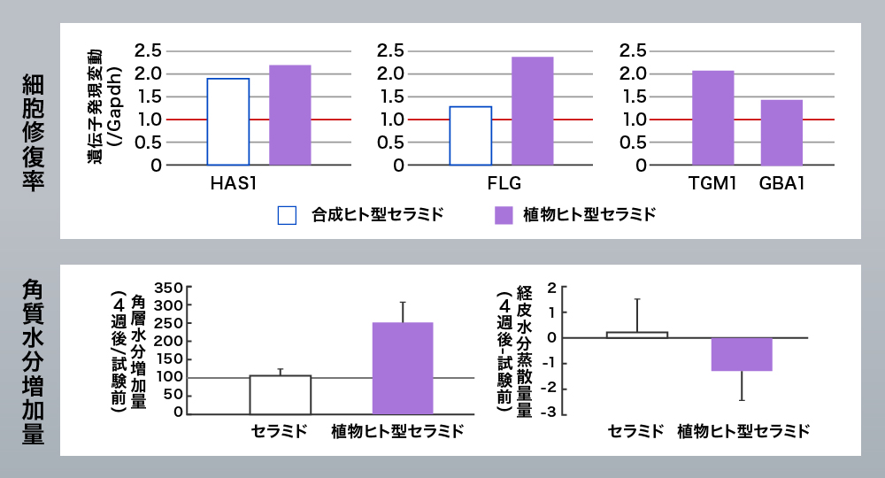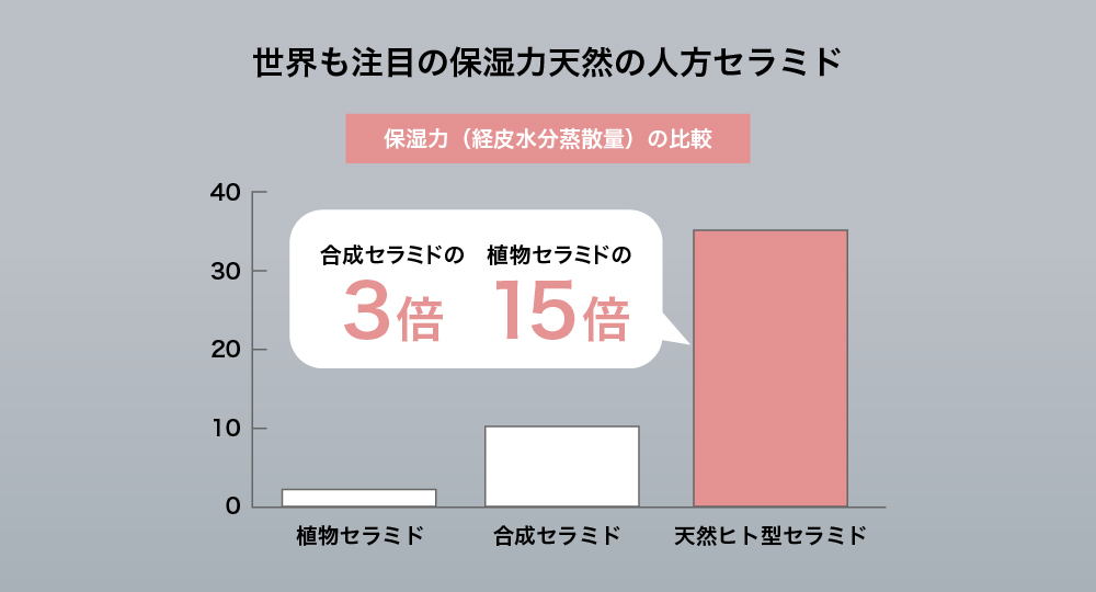 ヒト型セラミドは人間のセラミドと構造が一致しているため、肌バリアの再構築力が高く、植物由来とは大きな差が生じます。