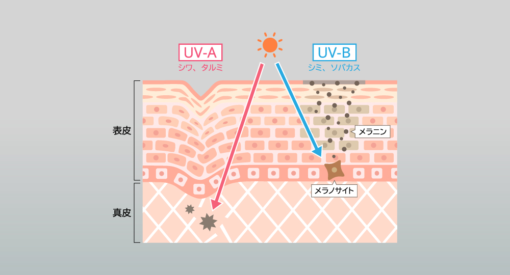 UV-Aは皮膚の深層にまで届き、コラーゲンやエラスチン、ヒアルロン酸などを減少させます。