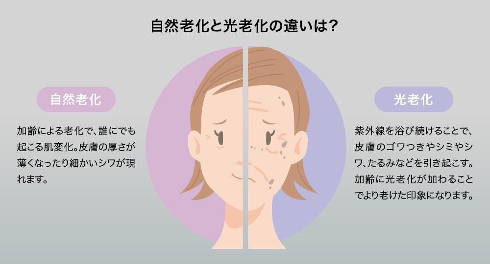しかし、この自然な老化に加えて紫外線をはじめとする光が加わることで、さらに進行するのが「光老化」です。