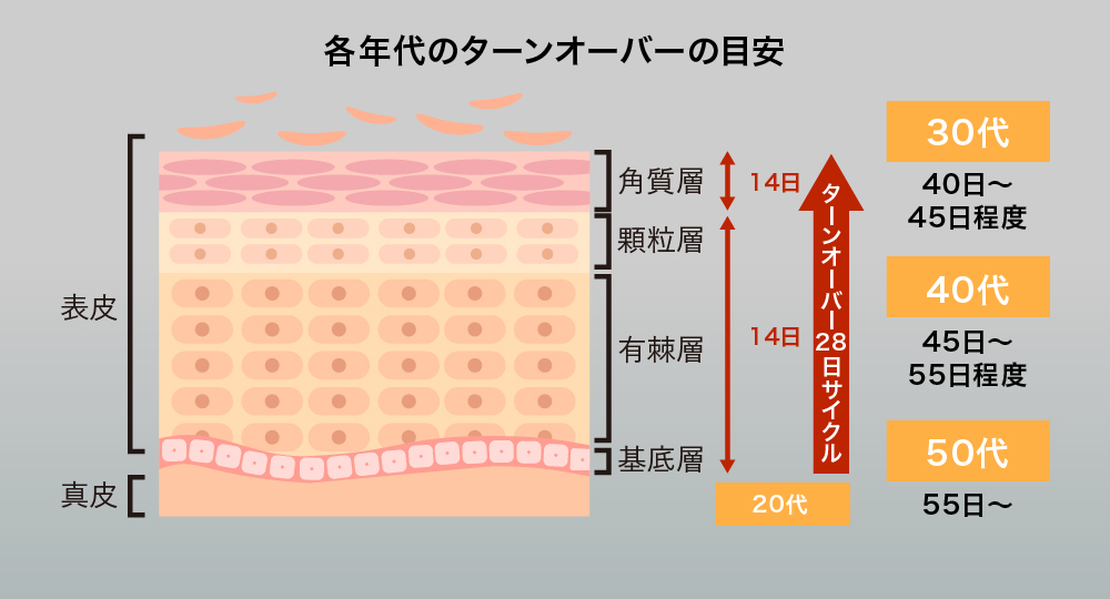 そのためターンオーバーは28日から40〜60日へと延び、角質層が厚くなり、光反射が鈍ることで、黄ぐすみが目立ちやすくなります。