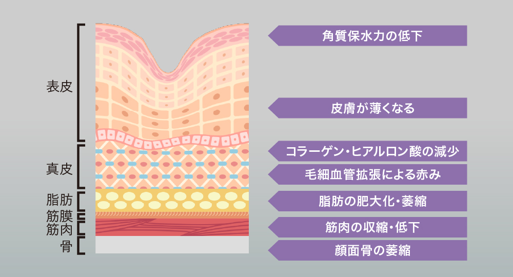 肌の深層・真皮では、コラーゲンやエラスチンの産生低下が進み密度がゆっくりと失われていきます。