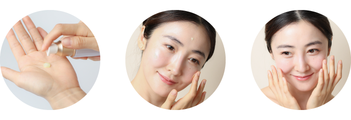 顔全体(ハリやシワなど気になる部位を重点)に塗布し、優しくなじませます。